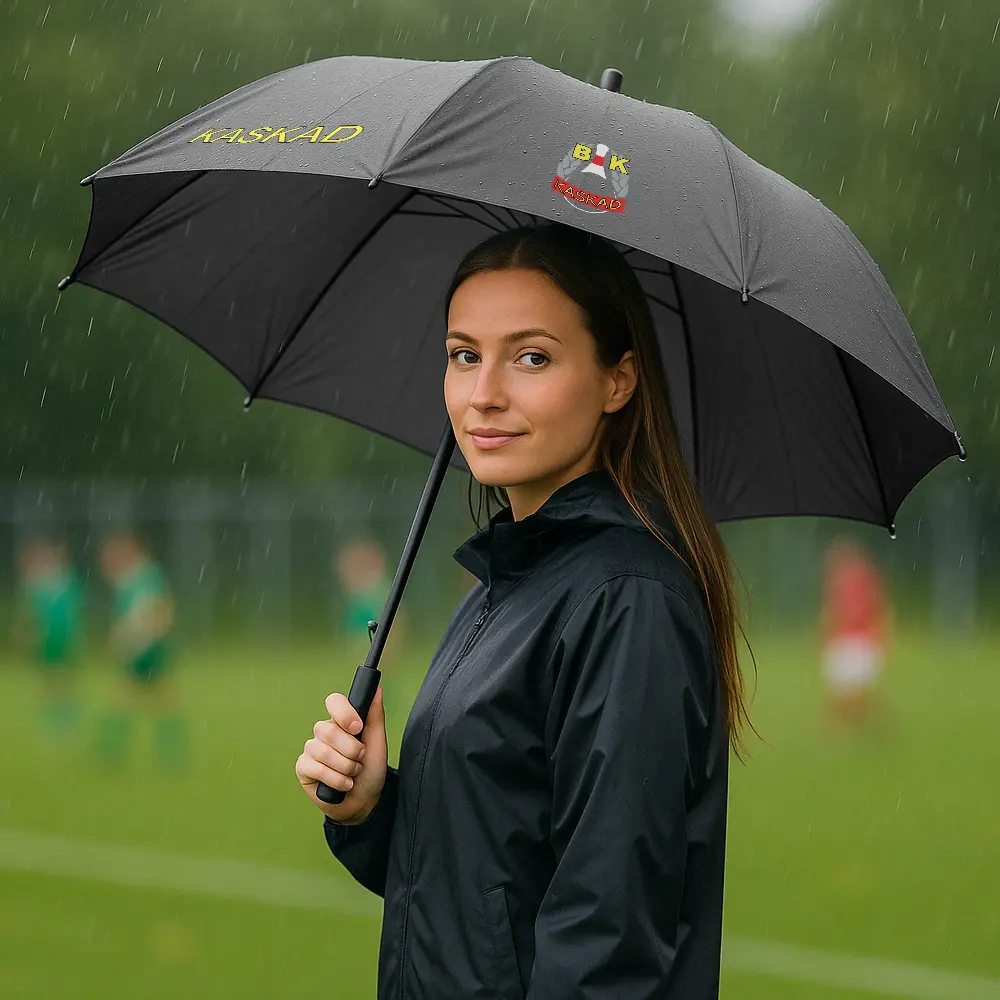 Vindtåligt paraply med BK Kaskads logga och texten ”Kaskad”. 129 cm diameter, robust konstruktion och skumgummihandtag för komfort och stil.